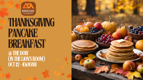Join us this Thanksgiving Sunday, October 12th, for a fantastic pancake breakfast in the Lion's Room at the DOW! Breakfast will start at 10:00 am, followed by a worship set and a message continuing our series in Acts.